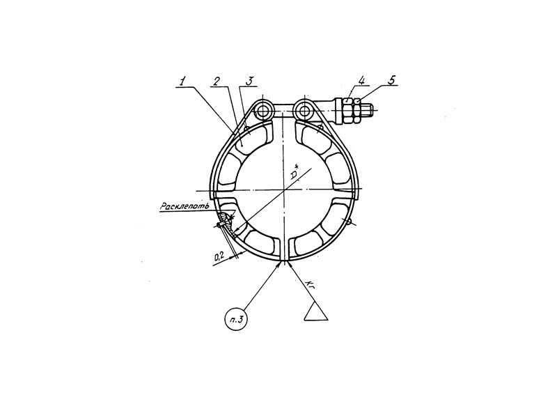 Конструкция хомута состоит из ленты в сборе, колодки, заклепки и гаек.