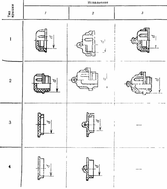 Крышки типов 1 и 2 подразделяют на 3 исполнения. Крышки типов 3 и 4 подразделяют на 2 исполнения.