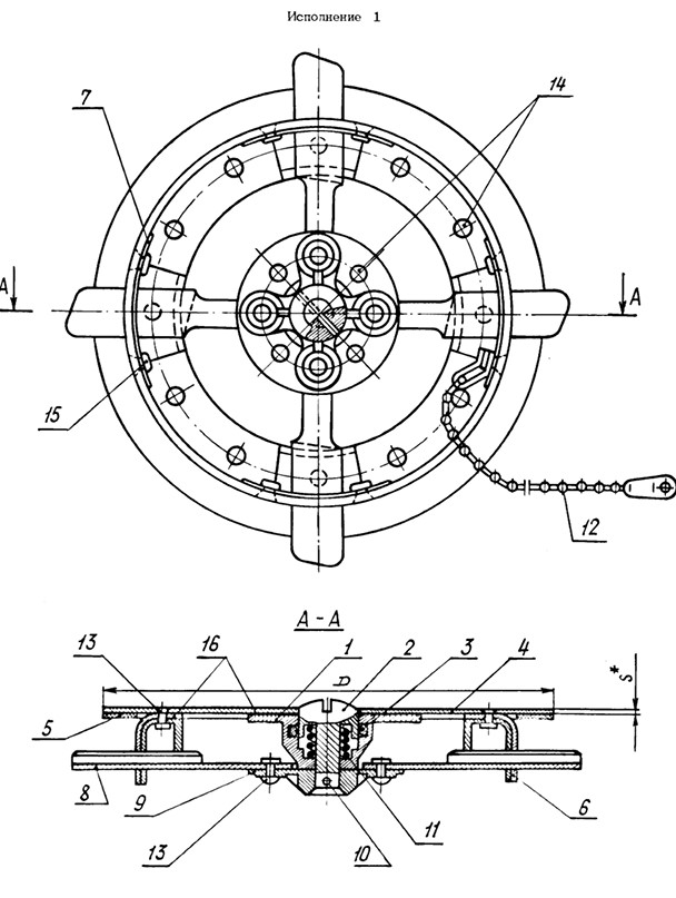 Крышки люков имеют 3 исполнения. Конструкция крышки состоит из фланца (ОСТ 1 13433-78), кнопки (ОСТ 1 13435-78), кольца (2186А), крышки (ОСТ 1 13436-78), прокладки (ОСТ 1 13438-78), корпуса (ОСТ 1 13440-78), сухаря (ОСТ 1 13442-78), лапки (ОСТ 1 13444-78), поводка (ОСТ 1 13445-78), штифта (ГОСТ 3128-70), пружины (1916А), цепочки (ОСТ 11360-73), заклепок (3515А, 3547А, 3531А) и ленты (У-20А ТУ 38-10574-75).