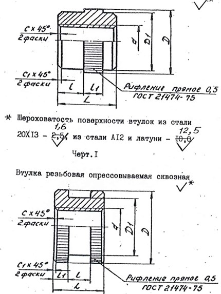 Конструкция втулки зависит от типа. Втулки резьбовые опрессовываемые бывают 4 исполнений: сквозные уменьшенные, сквозные, глухие и с заглушками. Втулки резьбовые развальцовываемые - глухие и сквозные. Последний тип - втулки резьбовые с наружной резьбой.