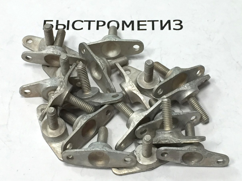 Конструкция клеммы состоит из металлической пластины с отверстиями и стержня с резьбой.