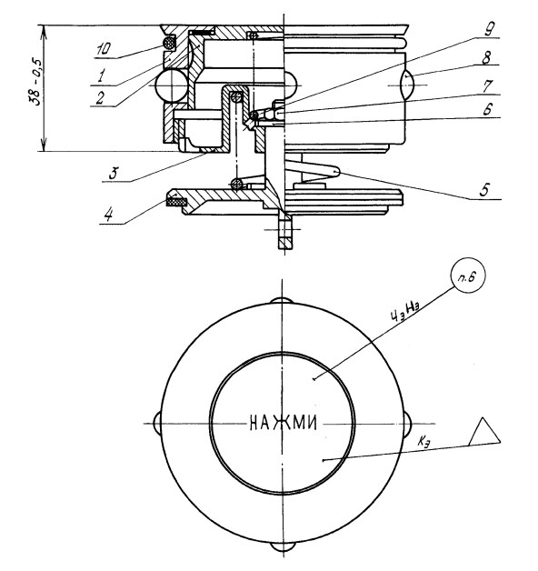 Конструкция пробки состоит из корпуса с уплотнением, кнопки, втулки, клапана с уплотнением, пружин, шайбы, гайки, шарика и кольца.