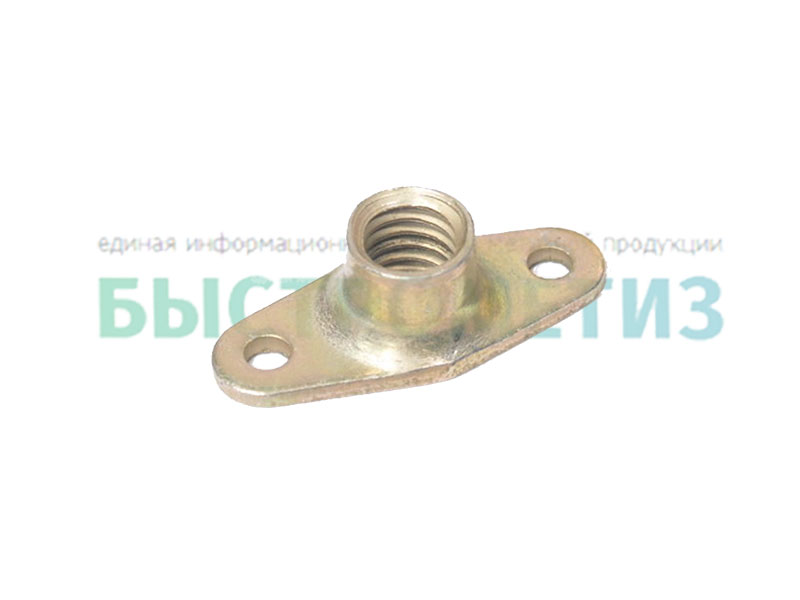 Конструкция гайки состоит из цилиндрического корпуса с внутренним отверстием с резьбой, и плоского основания с двумя отверстиями.